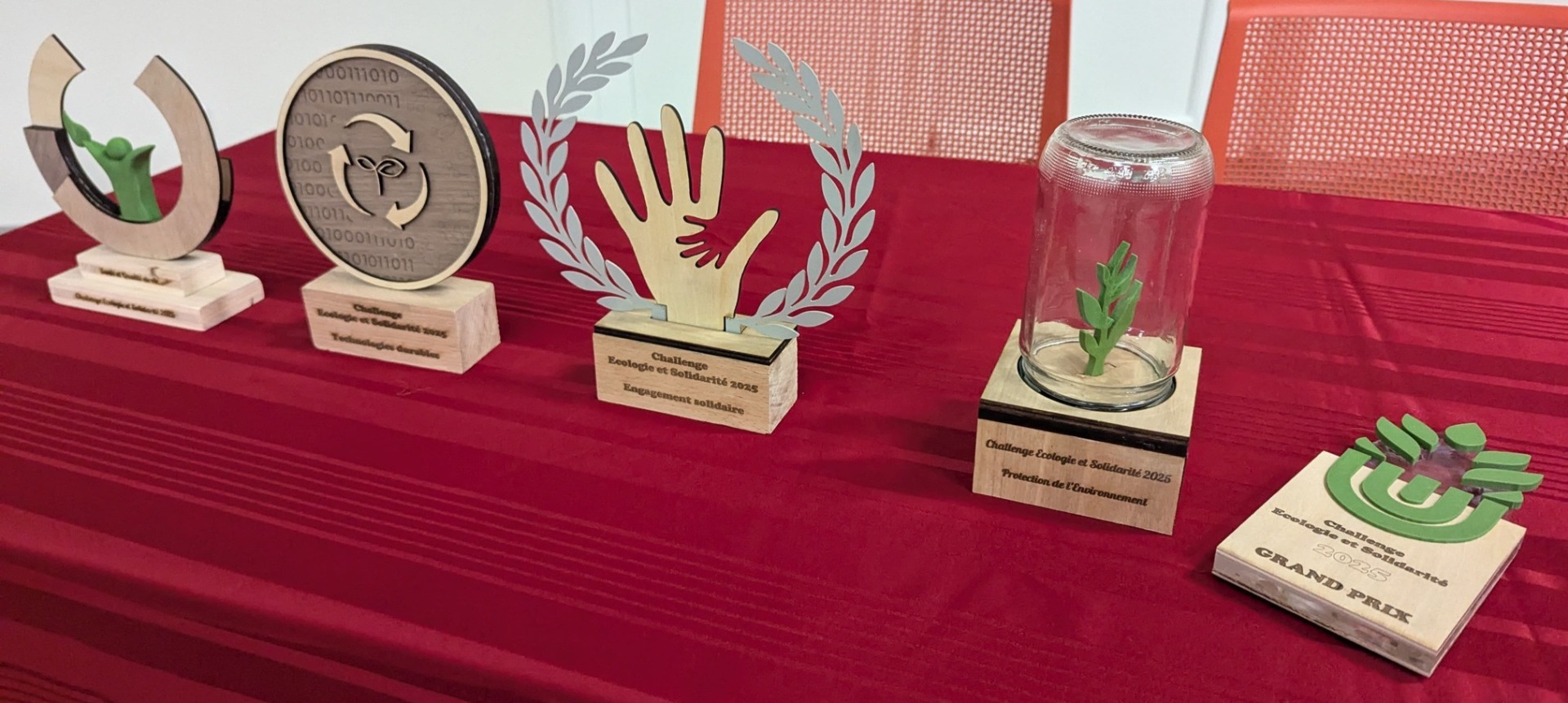 Les trophées ont été imaginés par les étudiants de l'IUT Saint-Dié (cours de design) et réalisés en matériaux recyclés par le lycée Baumont de Saint-Dié-des-Vosges :